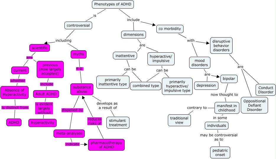 ADHD phenotypes -JDN Rev, Phenotypes of ADHD is controversial, controversial including myths, bipolar now thought to manifest in childhood, controversial including scientific, controversial including scientific, dimensions are hyperactive/ impulsive, current whether Absence of Hyperactivity, inattentive can be combined type, substance abuse dispelled by meta-analyses, pharmacotherapy of ADHD reduces risks of substance abuse
