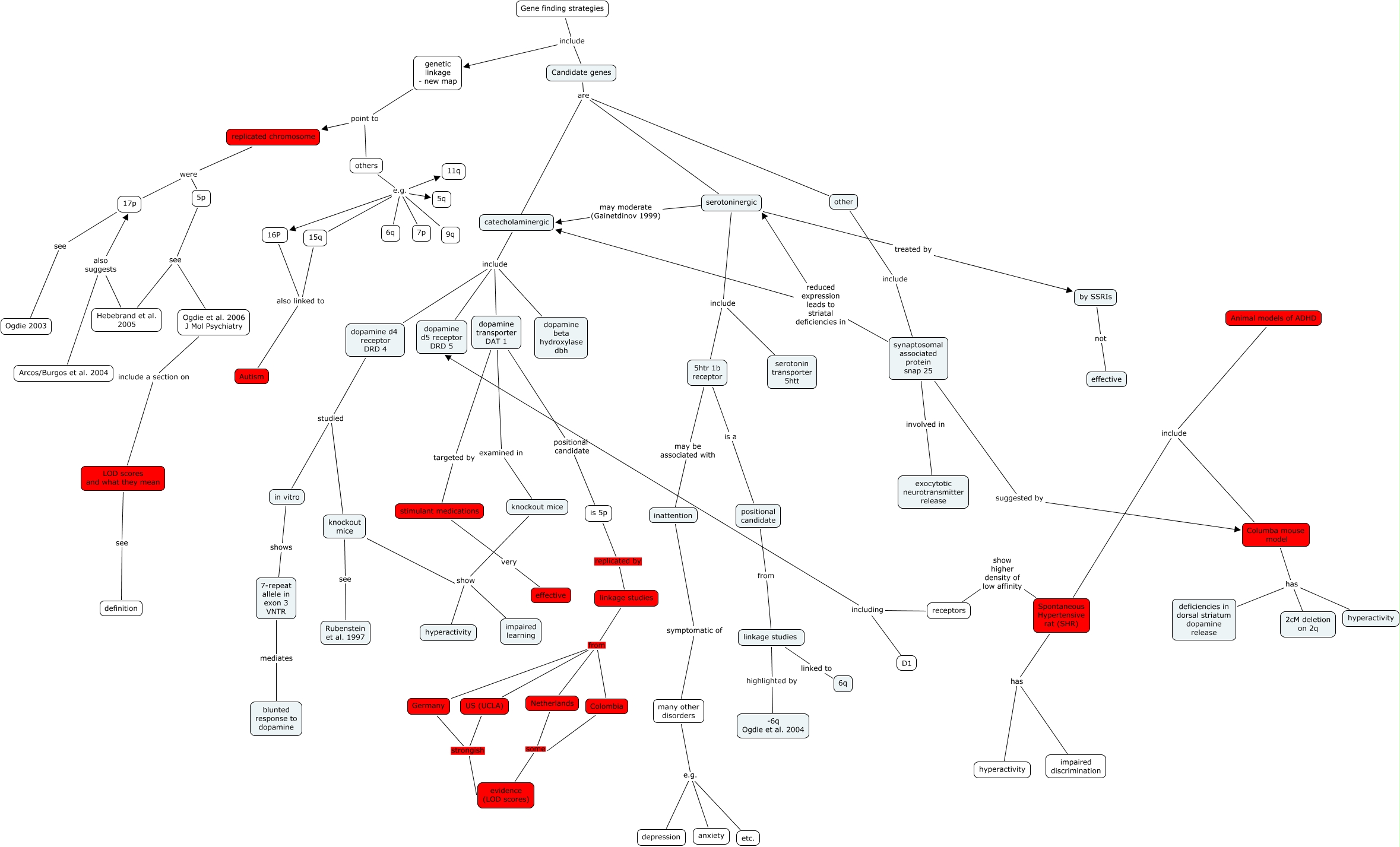 ADHD gene candidates, Candidate genes are catecholaminergic, 5htr 1b receptor is a positional candidate, Spontaneous Hypertensive rat (SHR) has impaired discrimination, 17p see Ogdie 2003, replicated chromosome were 17p, LOD scores and what they mean see definition, genetic linkage - new map point to replicated chromosome, others e.g. 15q, serotoninergic include serotonin transporter 5htt, dopamine transporter DAT 1 positional candidate is 5p