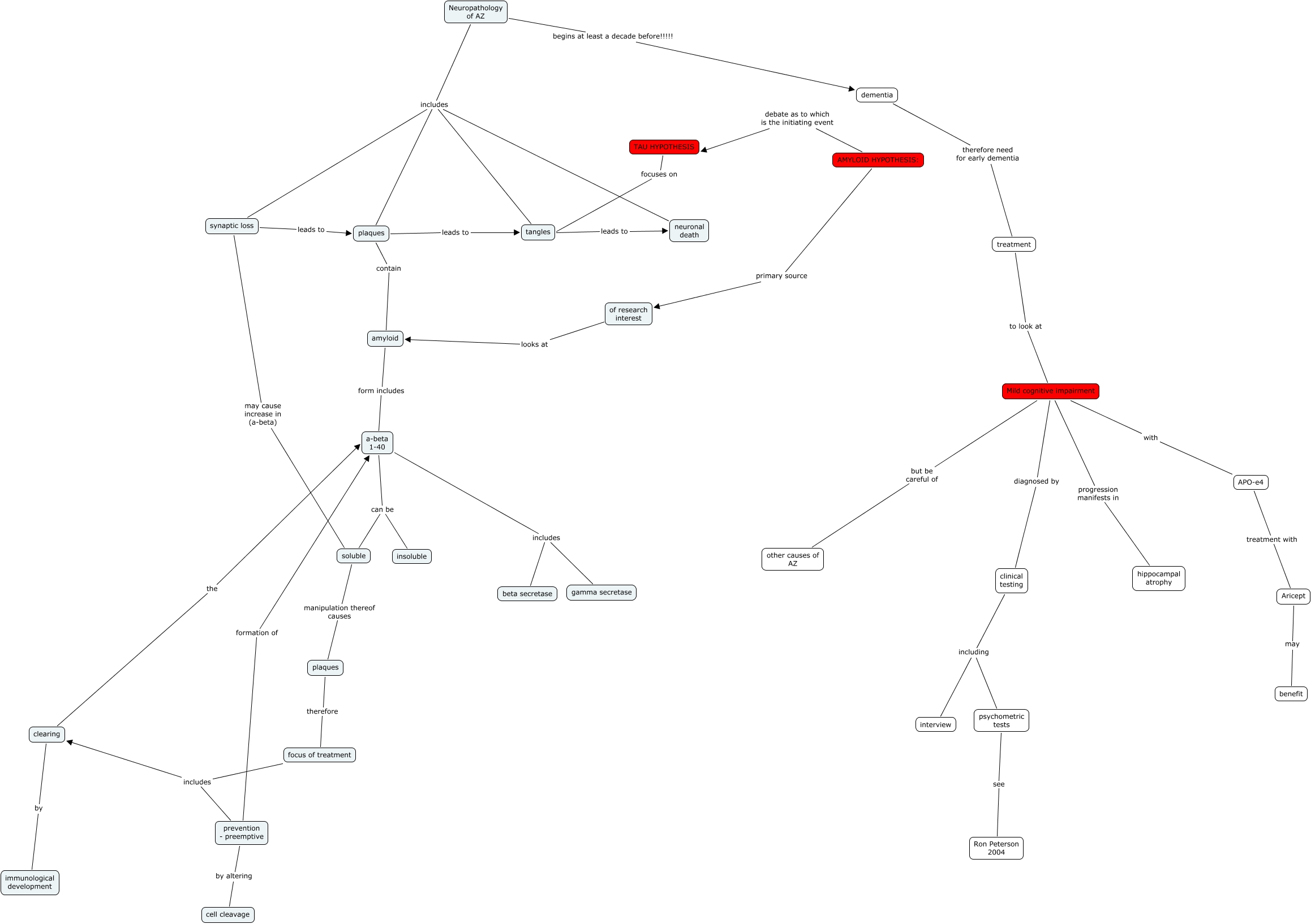 AZ neuropathology, AMYLOID HYPOTHESIS: debate as to which is the initiating event TAU HYPOTHESIS, focus of treatment includes clearing, clinical testing including psychometric tests, focus of treatment includes prevention - preemptive, treatment to look at Mild cognitive impairment, Mild cognitive impairment with APO-e4, plaques therefore focus of treatment, prevention - preemptive formation of a-beta 1-40, Mild cognitive impairment diagnosed by clinical testing, clinical testing including interview