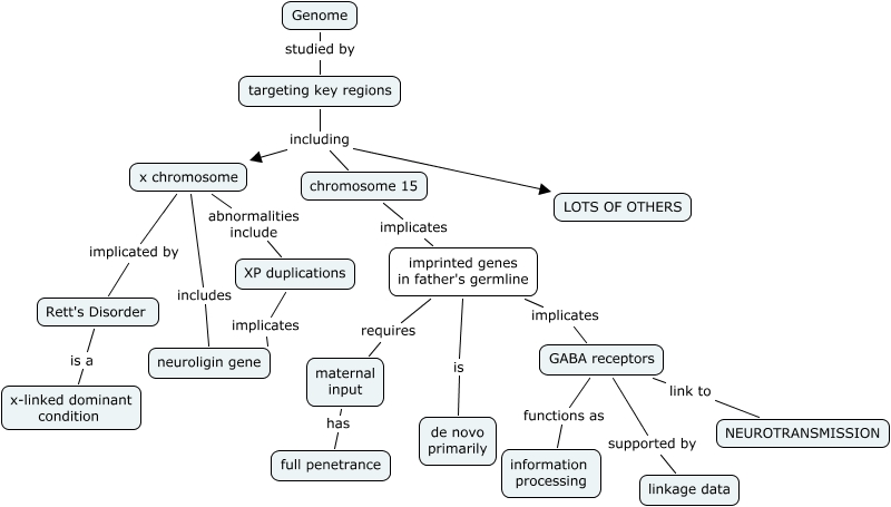 Autism genome - JDN Rev, chromosome 15 implicates imprinted genes in father's germline, Genome studied by targeting key regions, x chromosome implicated by Rett's Disorder, targeting key regions including chromosome 15, Rett's Disorder is a x-linked dominant condition, GABA receptors supported by linkage data, targeting key regions including x chromosome, XP duplications implicates neuroligin gene, imprinted genes in father's germline implicates GABA receptors, maternal input has full penetrance