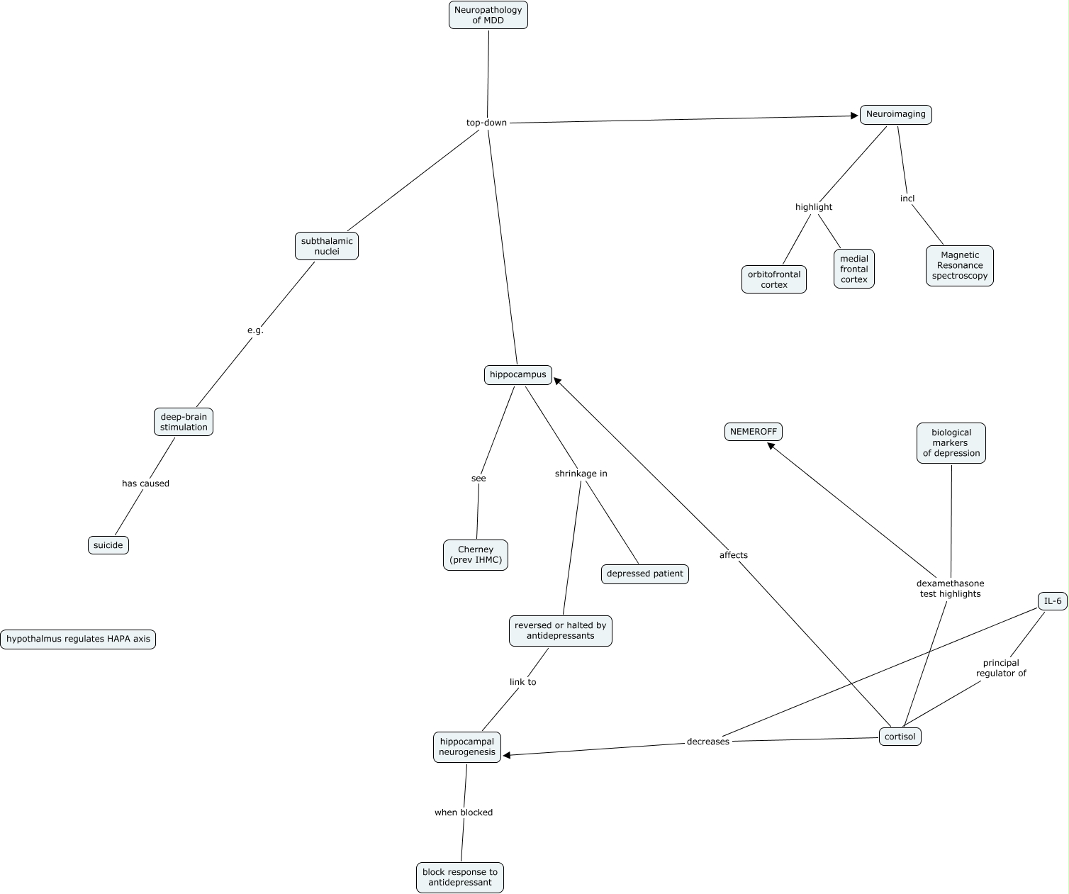 MDD neuropathology, subthalamic nuclei e.g. deep-brain stimulation, reversed or halted by antidepressants link to hippocampal neurogenesis, deep-brain stimulation has caused suicide, cortisol affects hippocampus, Neuropathology of MDD top-down subthalamic nuclei, Neuroimaging highlight orbitofrontal cortex, hippocampus see Cherney (prev IHMC), Neuropathology of MDD top-down hippocampus, cortisol decreases hippocampal neurogenesis, hippocampus shrinkage in reversed or halted by antidepressants