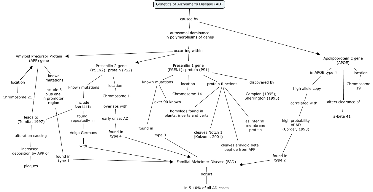 AZ genetics - DKS, Presenilin 1 gene (PSEN1); protein (PS1) known mutations over 90 known, high allele copy correlated with high probability of AD (Corder, 1993), Chromosome 1 overlaps with early onset AD, Presenilin 2 gene (PSEN2); protein (PS2) location Chromosome 1, Apolipoprotein E gene (APOE) in APOE type 4 high allele copy, include 3 plus one in promotor region found in type 1 Familial Alzheimer Disease (FAD), Amyloid Precursor Protein (APP) gene known mutations include 3 plus one in promotor region, Amyloid Precursor Protein (APP) gene leads to (Tomita, 1997) alteration causing, Presenilin 1 gene (PSEN1); protein (PS1) protein functions cleaves amyloid beta peptide from APP, Presenilin 1 gene (PSEN1); protein (PS1) protein functions as integral membrane protein