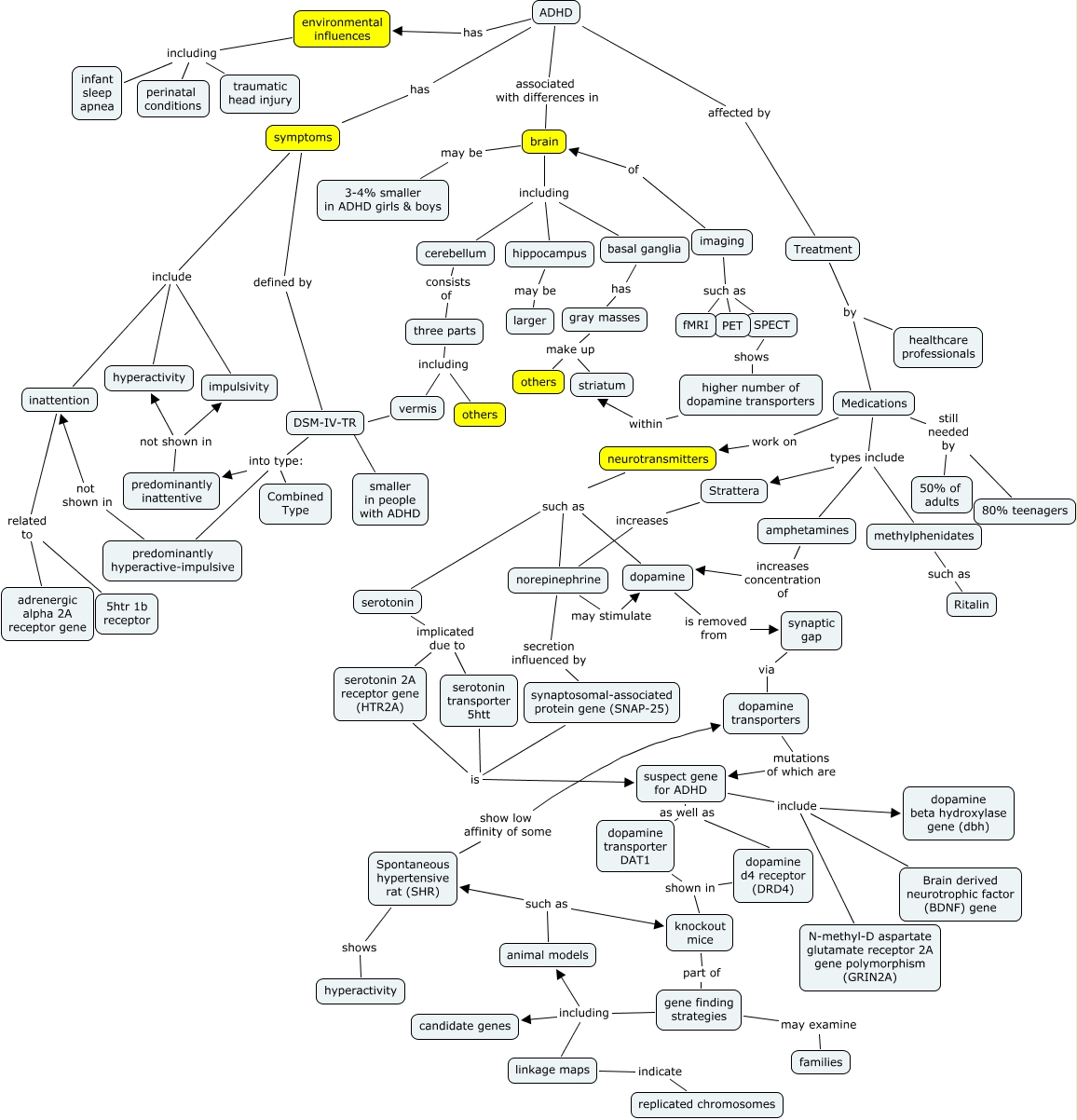 ADHD Reduced - JDN Rev, symptoms include hyperactivity, DSM-IV-TR into type: predominantly hyperactive-impulsive, suspect gene for ADHD include dopamine beta hydroxylase gene (dbh), inattention related to 5htr 1b receptor, symptoms include inattention, symptoms include impulsivity, Medications work on neurotransmitters, basal ganglia has gray masses, synaptosomal-associated protein gene (SNAP-25) is suspect gene for ADHD, Treatment by healthcare professionals