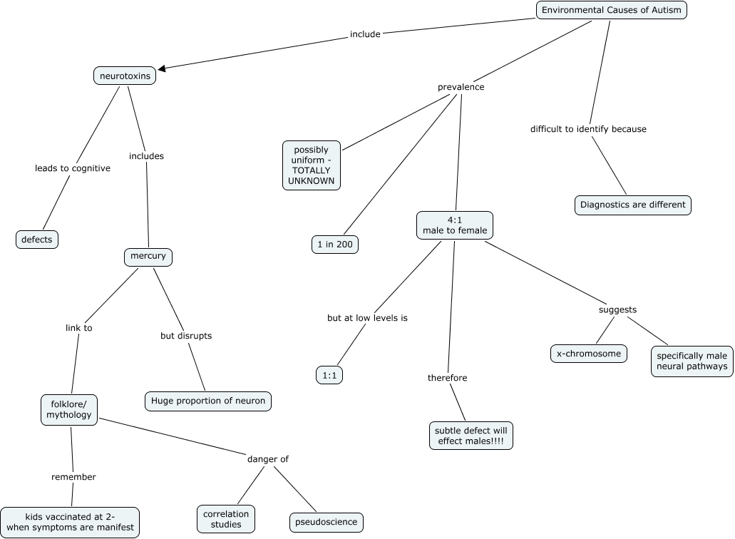 Autism Environmnetal causes, folklore/ mythology danger of correlation studies, 4:1 male to female but at low levels is 1:1, Environmental Causes of Autism prevalence possibly uniform - TOTALLY UNKNOWN, 4:1 male to female therefore subtle defect will effect males!!!!, Environmental Causes of Autism prevalence 1 in 200, folklore/ mythology danger of pseudoscience, neurotoxins leads to cognitive defects, 4:1 male to female suggests x-chromosome, Environmental Causes of Autism include neurotoxins, mercury link to folklore/ mythology