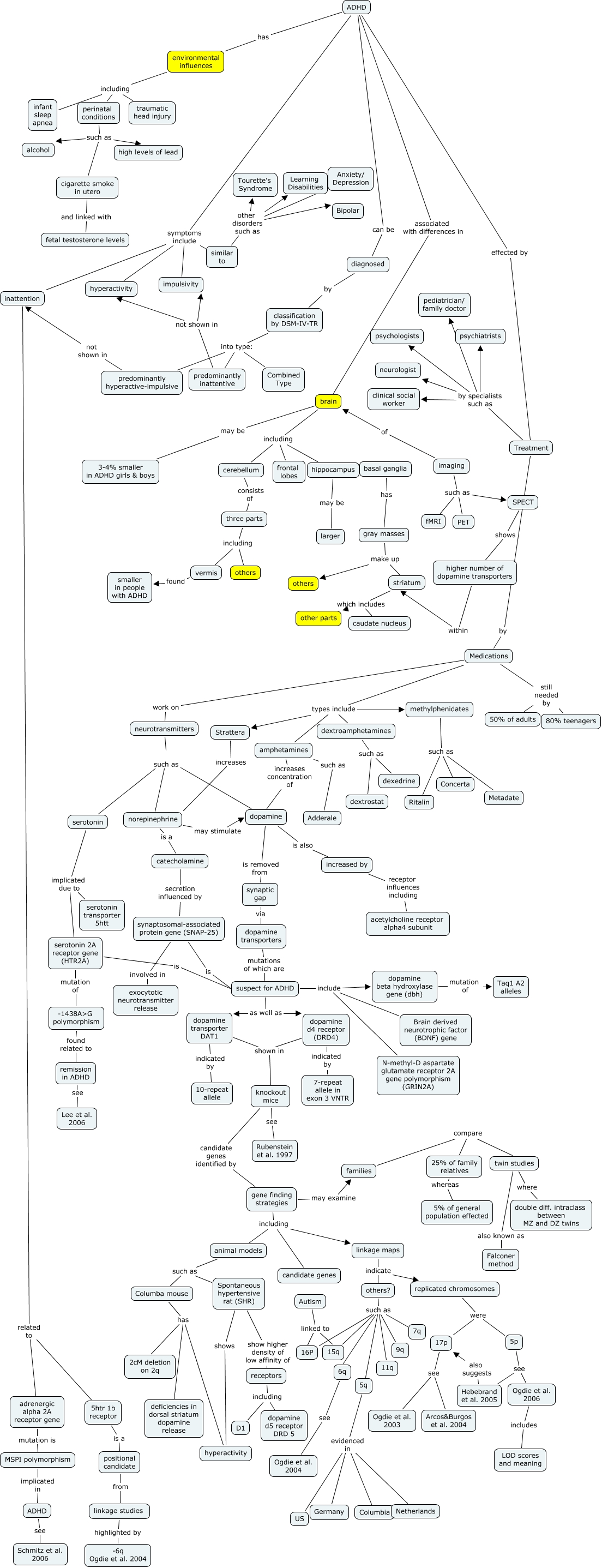 ADHD FINAL, linkage studies highlighted by -6q Ogdie et al. 2004, brain including cerebellum, dopamine transporter DAT1 indicated by 10-repeat allele, neurotransmitters such as dopamine, Medications still needed by 50% of adults, gene finding strategies including candidate genes, others? such as 11q, neurotransmitters such as serotonin, suspect for ADHD include dopamine beta hydroxylase gene (dbh), knockout mice candidate genes identified by gene finding strategies