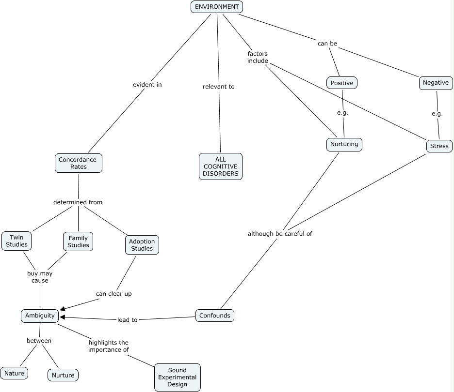 Environment, Concordance Rates determined from Adoption Studies, Negative e.g. Stress, Ambiguity between Nature, Confounds lead to Ambiguity, Concordance Rates determined from Family Studies, Twin Studies buy may cause Ambiguity, Family Studies buy may cause Ambiguity, ENVIRONMENT relevant to ALL COGNITIVE DISORDERS, Ambiguity between Nurture, Positive e.g. Nurturing