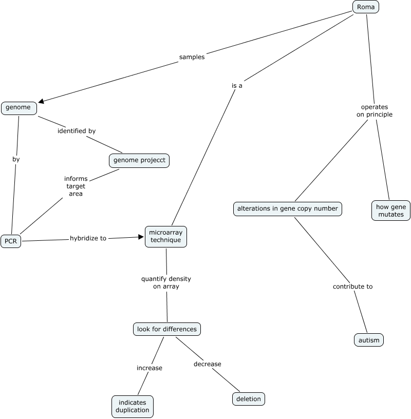 Roma, look for differences increase indicates duplication, PCR hybridize to microarray technique, microarray technique quantify density on array look for differences, Roma is a microarray technique, Roma samples genome, genome by PCR, genome projecct informs target area PCR, look for differences decrease deletion, genome identified by genome projecct, Roma operates on principle how gene mutates