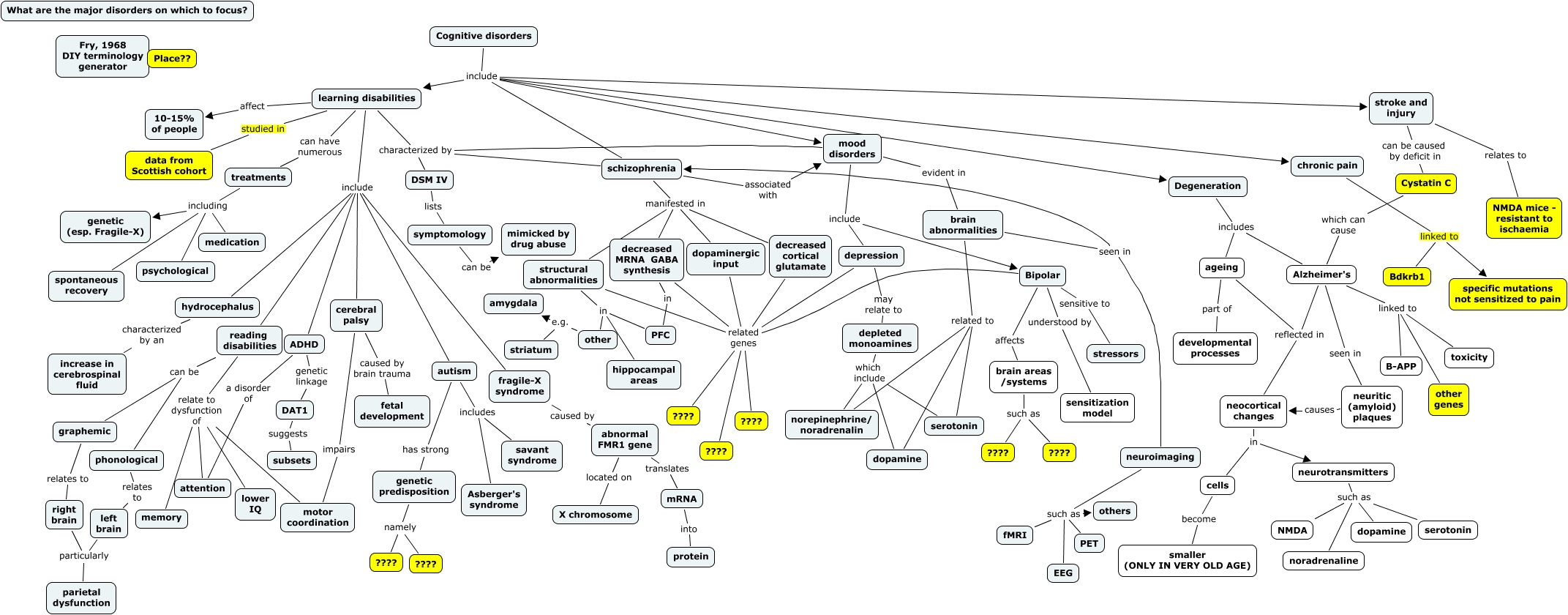Cognitive Disorders Seth, brain abnormalities related to serotonin, stroke and injury can be caused by deficit in Cystatin C, brain abnormalities seen in neuroimaging, learning disabilities include autism, ADHD a disorder of attention, stroke and injury relates to NMDA mice - resistant to ischaemia, treatments including medication, abnormal FMR1 gene translates mRNA, structural abnormalities related genes ????, Alzheimer's linked to other genes