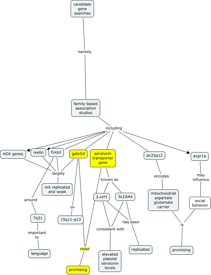 Autism Candidate genes, mitochondrial aspartate glutamate carrier is promising, family-based association studies including reelin, social behavior is promising, family-based association studies including HOX genes, gabrb3 on 15q11-q13, candidate gene searches namely family-based association studies, family-based association studies including slc25a12, reelin largely not replicated and weak, gabrb3 largely not replicated and weak, foxp2 largely not replicated and weak