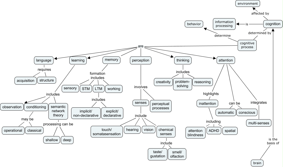 Cognition Level 2, chemical senses include smell/ olfaction, learning includes observation, semantic network theory processing can be deep, LTM includes implicit/ non-declarative, cognitive process are learning, memory formation includes sensory, senses include vision, thinking includes reasoning, cognitive process determine behavior, cognition determined by cognitive process