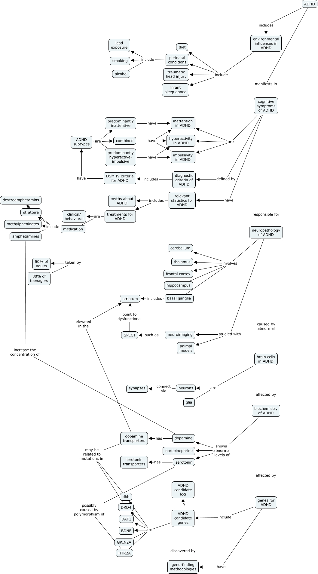 ADHD Level 2, predominantly hyperactive- impulsive have hyperactivity in ADHD, medication include methylphenidates, cognitive symptoms of ADHD are inattention in ADHD, basal ganglia includes striatum, brain cells in ADHD affected by biochemistry of ADHD, ADHD candidate genes in ADHD candidate loci, medication include amphetamines, brain cells in ADHD are glia, environmental influences in ADHD include perinatal conditions, amphetamines increase the concentration of dopamine