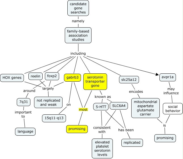 Autism Candidate genes - JDN rev, family-based association studies including reelin, mitochondrial aspartate glutamate carrier is promising, social behavior is promising, gabrb3 on 15q11-q13, family-based association studies including HOX genes, candidate gene searches namely family-based association studies, reelin largely not replicated and weak, family-based association studies including slc25a12, gabrb3 largely not replicated and weak, serotonin transporter gene known as 5-HTT