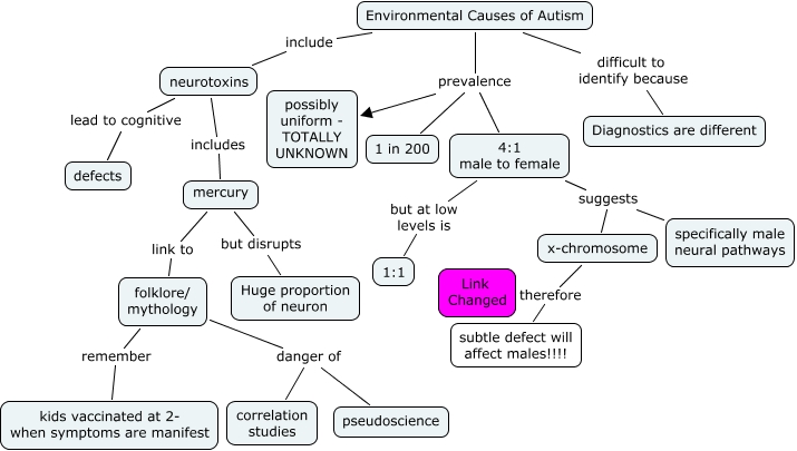 Autism Environmnetal causes - JDN Rev, x-chromosome therefore subtle defect will affect males!!!!, Environmental Causes of Autism prevalence possibly uniform - TOTALLY UNKNOWN, 4:1 male to female but at low levels is 1:1, folklore/ mythology danger of correlation studies, Environmental Causes of Autism prevalence 1 in 200, folklore/ mythology danger of pseudoscience, 4:1 male to female suggests x-chromosome, neurotoxins lead to cognitive defects, Environmental Causes of Autism include neurotoxins, mercury link to folklore/ mythology