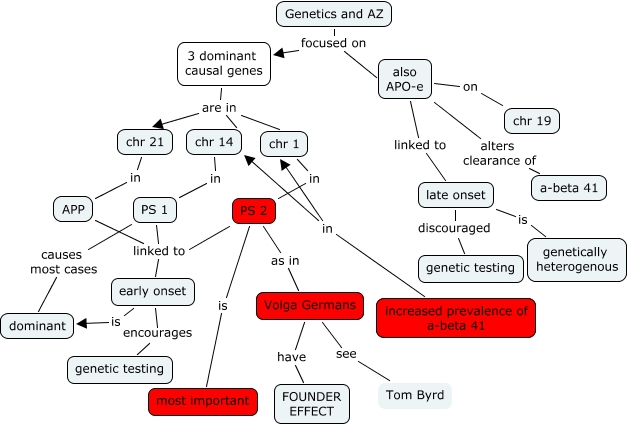 AZ genetics - JDN Rev, increased prevalence of a-beta 41 in chr 1, APP linked to early onset, early onset encourages genetic testing, Volga Germans have FOUNDER EFFECT, 3 dominant causal genes are in chr 1, Volga Germans see Tom Byrd, Genetics and AZ focused on 3 dominant causal genes, 3 dominant causal genes are in chr 21, also APO-e alters clearance of a-beta 41, PS 1 linked to early onset
