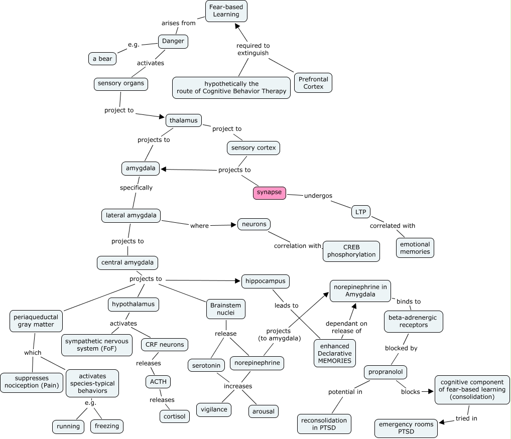 SH Fear based learning - JDN Rev, central amygdala projects to hippocampus, beta-adrenergic receptors blocked by propranolol, Brainstem nuclei release norepinephrine, Prefrontal Cortex required to extinguish hypothetically the route of Cognitive Behavior Therapy, Brainstem nuclei release serotonin, amygdala specifically lateral amygdala, activates species-typical behaviors e.g. freezing, lateral amygdala where neurons, enhanced Declarative MEMORIES dependant on release of norepinephrine in Amygdala, activates species-typical behaviors e.g. running