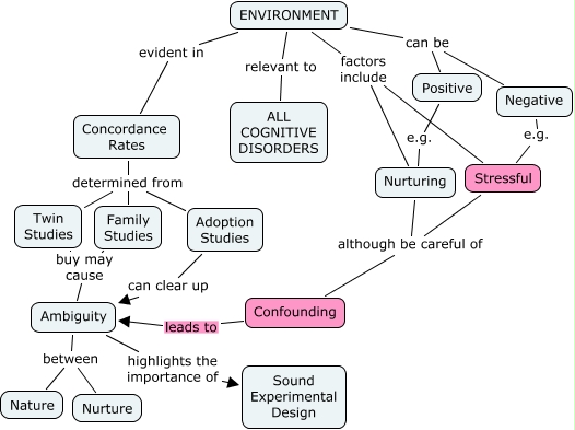 Environment - JDN Rev, Concordance Rates determined from Adoption Studies, Ambiguity between Nature, Negative e.g. Stressful, Concordance Rates determined from Family Studies, Confounding leads to Ambiguity, Family Studies buy may cause Ambiguity, Twin Studies buy may cause Ambiguity, ENVIRONMENT relevant to ALL COGNITIVE DISORDERS, Positive e.g. Nurturing, Ambiguity between Nurture