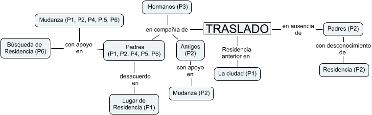 Traslado, Amigos (P2) con apoyo en Mudanza (P2), TRASLADO en compañía de Padres (P1, P2, P4, P5, P6), TRASLADO en compañía de Amigos (P2), Padres (P1, P2, P4, P5, P6) con apoyo en Búsqueda de Residencia (P6), TRASLADO en compañía de Hermanos (P3), TRASLADO Residencia anterior en La ciudad (P1), TRASLADO en ausencia de Padres (P2), Padres (P1, P2, P4, P5, P6) desacuerdo en Lugar de Residencia (P1), Padres (P1, P2, P4, P5, P6) con apoyo en Mudanza (P1, P2, P4, P,5, P6), Padres (P2) con desconocimiento de Residencia (P2)
