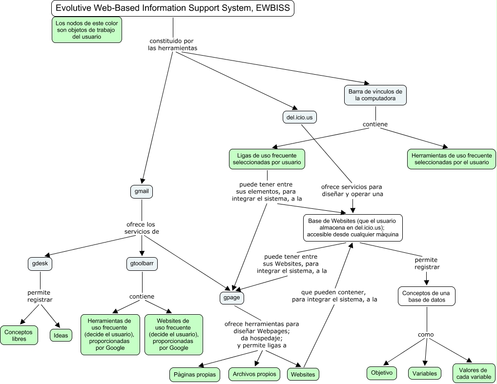 Evolutive Web-Based Information Support System, EWBISS, Ligas de uso frecuente seleccionadas por usuario puede tener entre sus elementos, para integrar el sistema, a la Base de Websites (que el usuario almacena en del.icio.us); accesible desde cualquier máquina, del.icio.us ofrece servicios para diseñar y operar una Base de Websites (que el usuario almacena en del.icio.us); accesible desde cualquier máquina, Websites que pueden contener, para integrar el sistema, a la Base de Websites (que el usuario almacena en del.icio.us); accesible desde cualquier máquina, gpage ofrece herramientas para diseñar Webpages; da hospedaje; y permite ligas a Archivos propios, Evolutive Web-Based Information Support System, EWBISS constituido por las herramientas del.icio.us, Evolutive Web-Based Information Support System, EWBISS constituido por las herramientas gmail, gpage ofrece herramientas para diseñar Webpages; da hospedaje; y permite ligas a Páginas propias, Base de Websites (que el usuario almacena en del.icio.us); accesible desde cualquier máquina permite registrar Conceptos de una base de datos, gtoolbarr contiene Websites de uso frecuente (decide el usuario), proporcionadas por Google, gdesk permite registrar Ideas