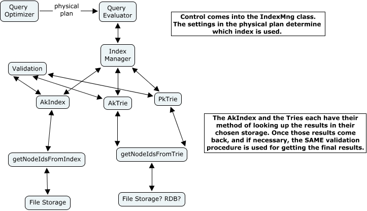 Index Usage, Index Manager PkTrie, Index Manager AkIndex, getNodeIdsFromTrie File Storage? RDB?, PkTrie getNodeIdsFromTrie, Index Manager AkTrie, AkIndex getNodeIdsFromIndex, PkTrie Validation, Query Optimizer physical plan Query Evaluator, AkIndex Validation, getNodeIdsFromIndex File Storage
