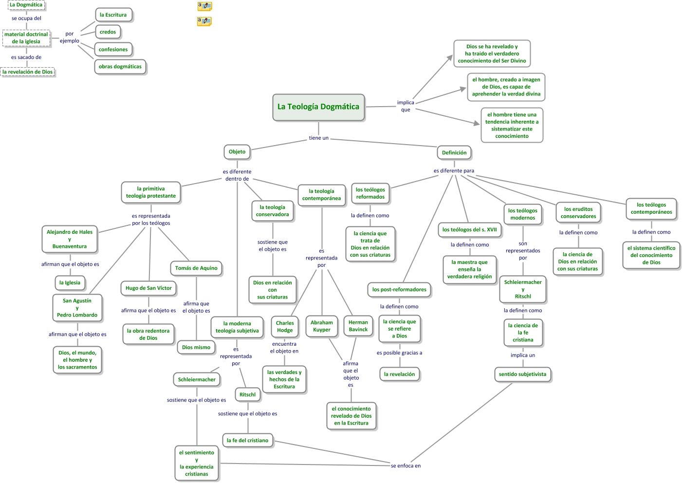 Aquest mapa conceptual conté informació relacionada amb: La Idea de la Teología Dogmática, sentido subjetivista se enfoca en el sentimiento y la experiencia cristianas, material doctrinal de la iglesia por ejemplo credos, Definición es diferente para los teólogos contemporáneos, La Teología Dogmática tiene un Objeto, La Dogmática se ocupa del material doctrinal de la iglesia, San Agustín y Pedro Lombardo afirman que el objeto es Dios, el mundo, el hombre y los sacramentos, Alejandro de Hales y Buenaventura afirman que el objeto es la Iglesia, la teología contemporánea es representada por Abraham Kuyper, Objeto es diferente dentro de la primitiva teología protestante, la primitiva teología protestante es representada por los teólogos Hugo de San Víctor, la ciencia que se refiere a Dios es posible gracias a la revelación, Schleiermacher sostiene que el objeto es el sentimiento y la experiencia cristianas, la moderna teología subjetiva es representada por Schleiermacher, La Teología Dogmática implica que el hombre tiene una tendencia inherente a sistematizar este conocimiento, material doctrinal de la iglesia por ejemplo la Escritura, Hugo de San Víctor afirma que el objeto es la obra redentora de Dios, Charles Hodge encuentra el objeto en las verdades y hechos de la Escritura, los teólogos contemporáneos la definen como el sistema científico del conocimiento de Dios, la primitiva teología protestante es representada por los teólogos San Agustín y Pedro Lombardo, Objeto es diferente dentro de la teología contemporánea