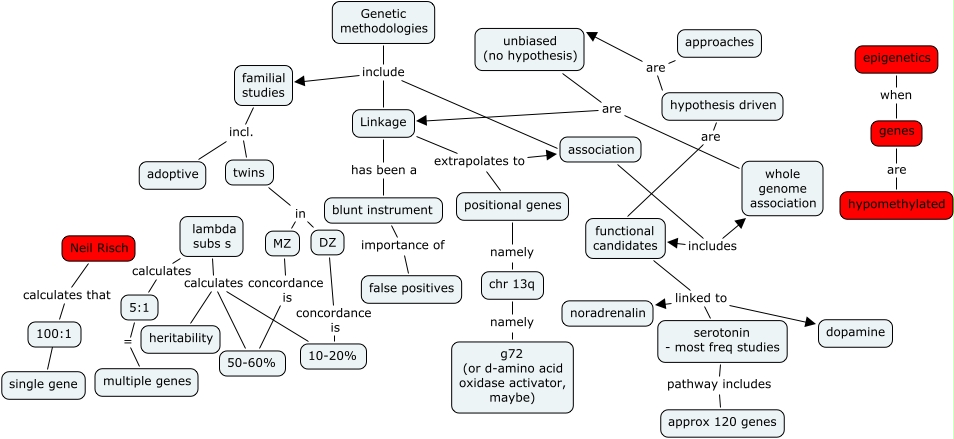 BD genetics meth JDN Rev, functional candidates linked to noradrenalin, Linkage extrapolates to association, functional candidates linked to serotonin - most freq studies, positional genes namely chr 13q, Genetic methodologies include association, functional candidates linked to dopamine, 100:1 = single gene, epigenetics when genes, unbiased (no hypothesis) are whole genome association, approaches are unbiased (no hypothesis)