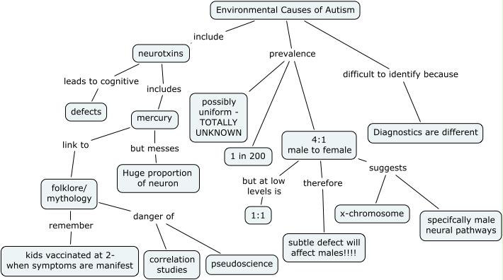 Environmnetal causes autism JDN Rev, Environmental Causes of Autism prevalence possibly uniform - TOTALLY UNKNOWN, 4:1 male to female but at low levels is 1:1, folklore/ mythology danger of correlation studies, Environmental Causes of Autism prevalence 1 in 200, 4:1 male to female therefore subtle defect will affect males!!!!, folklore/ mythology danger of pseudoscience, 4:1 male to female suggests x-chromosome, neurotxins leads to cognitive defects, Environmental Causes of Autism include neurotxins, mercury link to folklore/ mythology