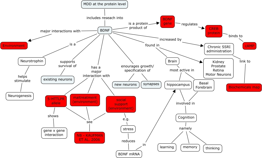 MDD protein JDN Rev, CREB protein binds to cAMP, Cognition namely learning, BDNF has a major interaction with 5-HTTLPR allele, BDNF found in Kidney Prostate Retina Motor Neurons, BDNF enourages growth/ specification of synapses, 5-HTTLPR allele see NB - KAUFMAN ET AL. 2006, BDNF is a Neurotrophin, Basal Forebrain involved in Cognition, BDNF gene regulates CREB protein, BDNF found in Brain