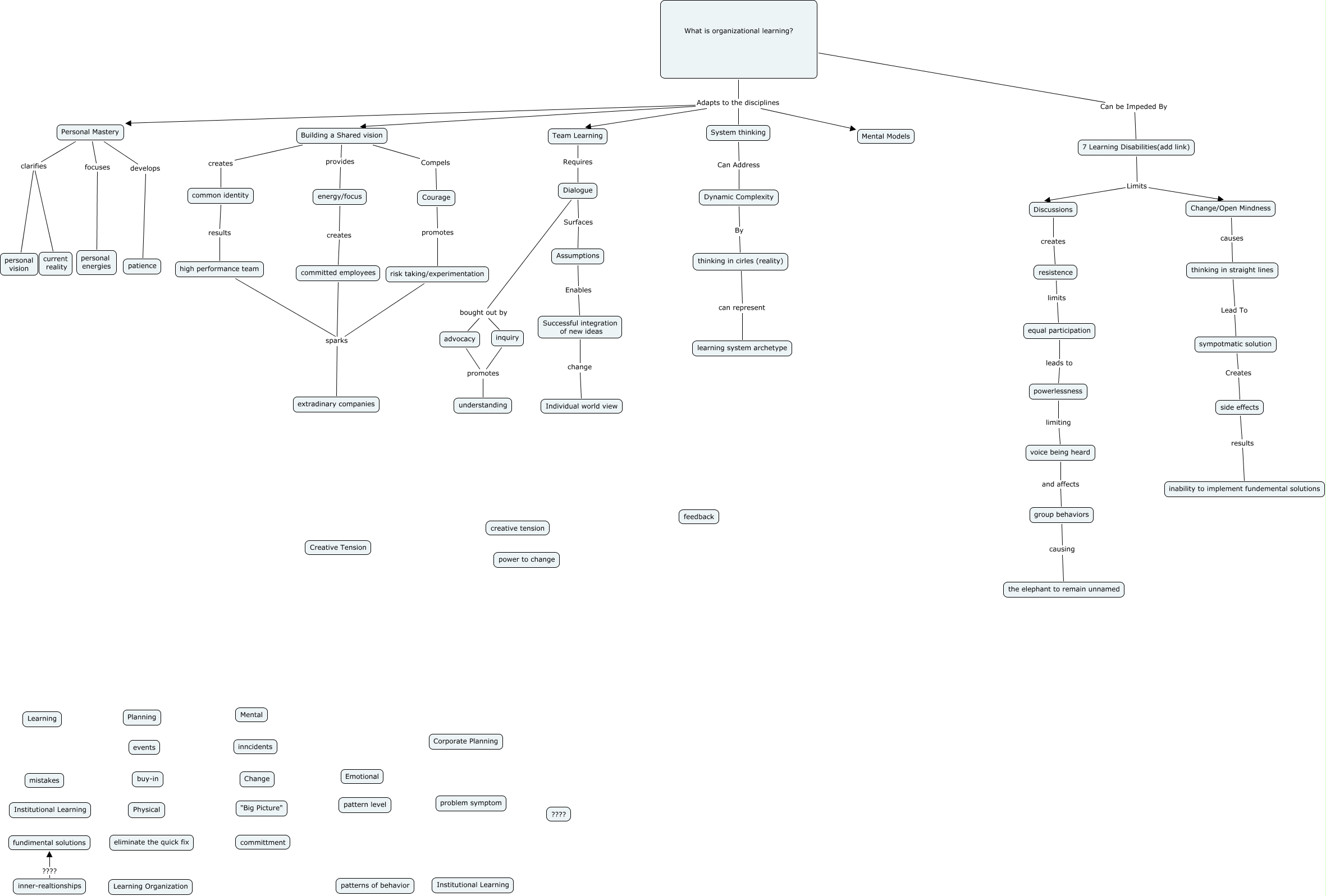 This Concept Map has information related to: Revised Group Environment, Team Learning Requires Dialogue, thinking in cirles (reality) can represent learning system archetype, Personal Mastery focuses personal energies, resistence limits equal participation, side effects results inability to implement fundemental solutions, advocacy promotes understanding, Assumptions Enables Successful integration of new ideas, What is organizational learning? Adapts to the disciplines Personal Mastery, What is organizational learning? Adapts to the disciplines Team Learning, Dynamic Complexity By thinking in cirles (reality)