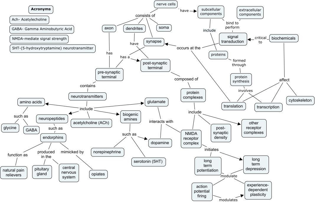 Biochemicals Level 2 JDN Rev, protein synthesis involves translation, protein complexes include NMDA receptor complex, long term depression modulate action potential firing, protein complexes include other receptor complexes, protein synthesis involves transcription, subcellular components bind to perform signal transduction, proteins formed through protein synthesis, amino acids such as GABA, nerve cells consists of soma, dendrites have post-synaptic terminal