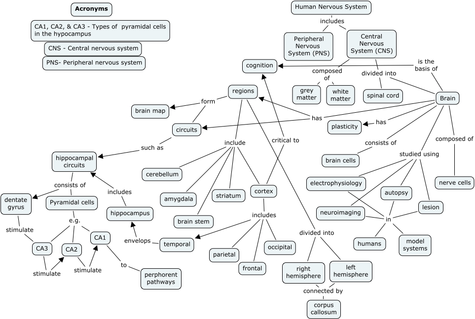 Brain Level 2 JDN Rev, regions include brain stem, regions divided into left hemisphere, dentate gyrus stimulate CA3, hippocampal circuits consists of dentate gyrus, cortex includes parietal, Brain has regions, regions divided into right hemisphere, autopsy in model systems, regions include cerebellum, CA3 stimulate CA2