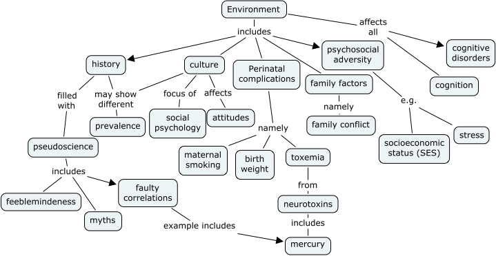 Environment Level 2 JDN Rev, Environment includes psychosocial adversity, psychosocial adversity e.g. socioeconomic status (SES), pseudoscience includes feeblemindeness, pseudoscience includes faulty correlations, Environment affects all cognition, Environment affects all cognitive disorders, faulty correlations example includes mercury, culture affects attitudes, Environment includes history, Perinatal complications namely birth weight