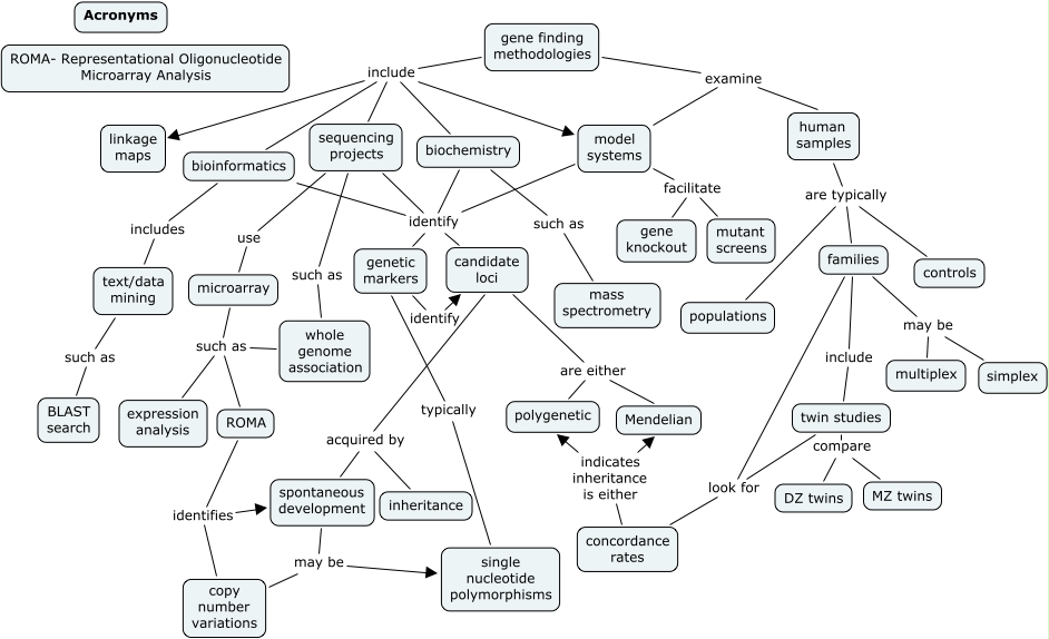 Gene finding level 2 JDN Rev, concordance rates indicates inheritance is either polygenetic, spontaneous development may be copy number variations, human samples are typically families, candidate loci acquired by inheritance, gene finding methodologies include bioinformatics, gene finding methodologies examine model systems, gene finding methodologies include linkage maps, model systems facilitate mutant screens, model systems facilitate gene knockout, concordance rates indicates inheritance is either Mendelian