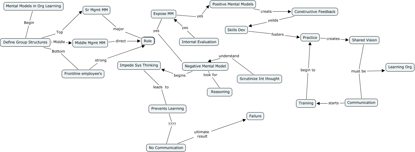 This Concept Map has information related to: Group 2 Concept Map, Constructive Feedback yeilds Skills Dev, No Communication ultimate result Failure, Impede Sys Thinking leads to Prevents Learning, Skills Dev fosters Practice, Sr Mgmt MM major ????, Define Group Structures Middle Middle Mgmt MM, Scrutinize Int thought understand Negative Mental Model, Mental Models in Org Learning Begin Define Group Structures, Expose MM yes Positive Mental Models, Negative Mental Model look for Reasoning