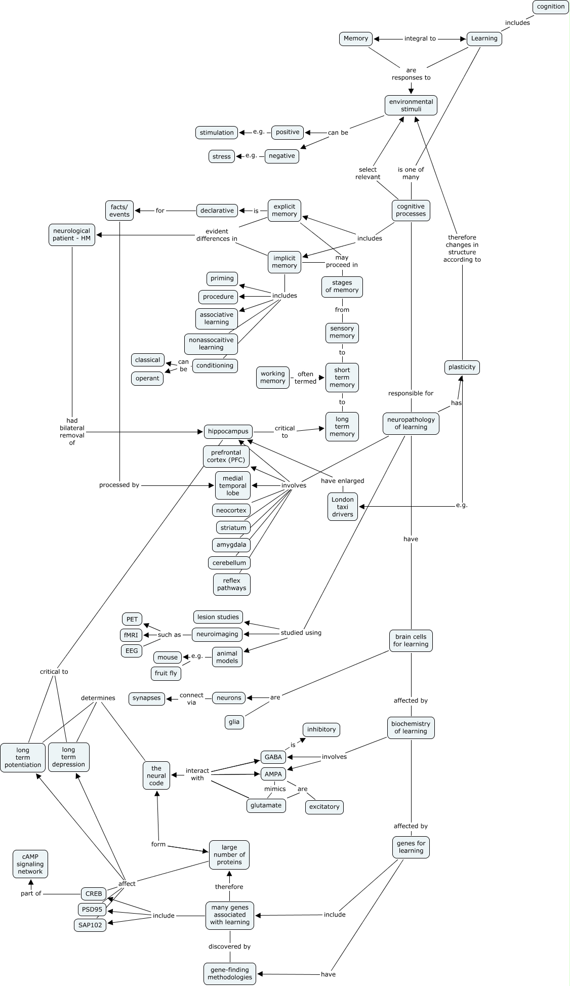 Learning Level 2, neuroimaging such as EEG, neuropathology of learning have brain cells for learning, implicit memory includes associative learning, many genes associated with learning discovered by gene-finding methodologies, biochemistry of learning involves GABA, neuropathology of learning studied using neuroimaging, cognitive processes includes implicit memory, cognition includes Learning, large number of proteins affect long term potentiation, Learning integral to Memory
