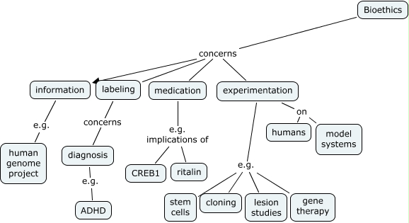 Bioethics Level 2, labeling concerns diagnosis, medication e.g. implications of ritalin, experimentation on model systems, experimentation e.g. cloning, information e.g. human genome project, experimentation on humans, experimentation e.g. lesion studies, Bioethics concerns experimentation, Bioethics concerns medication, Bioethics concerns labeling