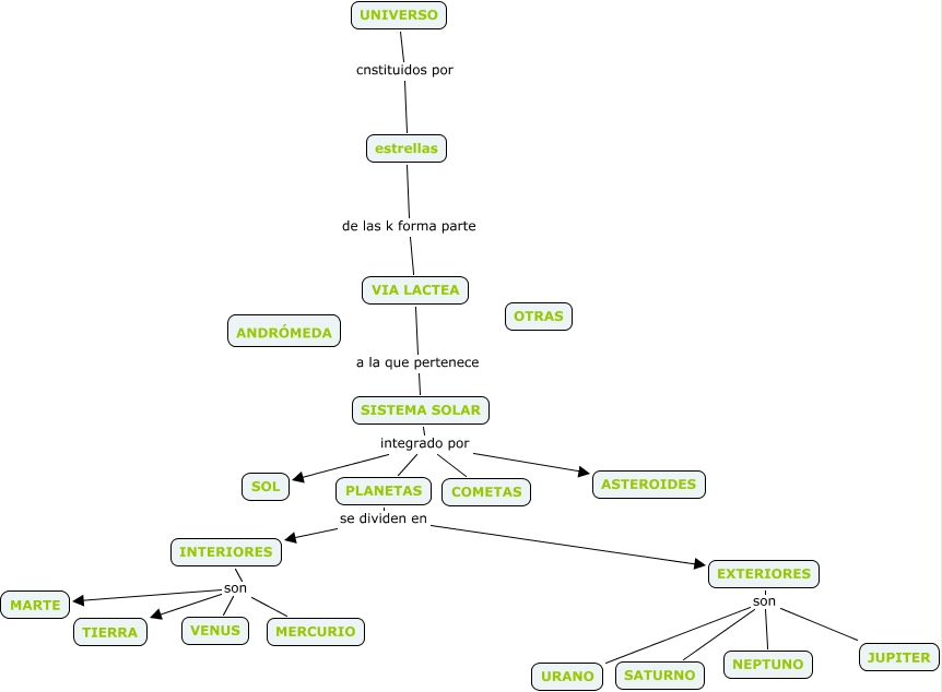 Este mapa conceptual tiene información relacionada a: UD1 DIEGO SAN MARTIN FORNELL, SISTEMA SOLAR integrado por ASTEROIDES, estrellas de las k forma parte VIA LACTEA, UNIVERSO cnstituidos por estrellas, EXTERIORES son JUPITER, INTERIORES son TIERRA, INTERIORES son MERCURIO, SISTEMA SOLAR integrado por PLANETAS, EXTERIORES son SATURNO, PLANETAS se dividen en EXTERIORES, PLANETAS se dividen en INTERIORES