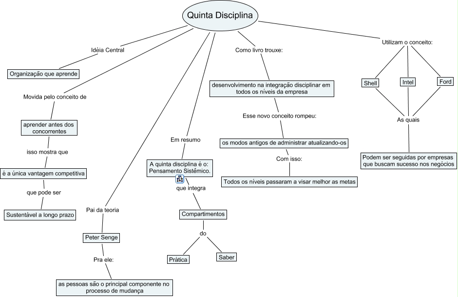 Este Mapa Conceitual tem informações relacionadas a: A quinta disciplina, Quinta Disciplina Movida pelo conceito de aprender antes dos concorrentes, Intel As quais Podem ser seguidas por empresas que buscam sucesso nos negócios, Quinta Disciplina Pai da teoria Peter Senge, Quinta Disciplina Idéia Central Organização que aprende, Quinta Disciplina Utilizam o conceito: Ford, aprender antes dos concorrentes isso mostra que é a única vantagem competitiva, Compartimentos do Saber, Quinta Disciplina Como livro trouxe: desenvolvimento na integração disciplinar em todos os níveis da empresa, Quinta Disciplina Utilizam o conceito: Intel, A quinta disciplina é o: Pensamento Sistêmico. que integra Compartimentos