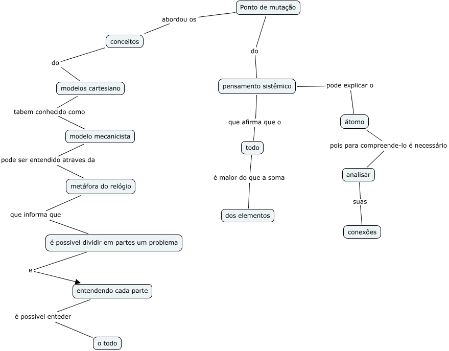 Este Mapa Conceitual tem informações relacionadas a: Ponto de mutação, conceitos do modelos cartesiano, é possivel dividir em partes um problema e entendendo cada parte, todo é maior do que a soma dos elementos, entendendo cada parte é possível enteder o todo, modelos cartesiano tabem conhecido como modelo mecanicista, Ponto de mutação do pensamento sistêmico, pensamento sistêmico pode explicar o átomo, pensamento sistêmico que afirma que o todo, modelo mecanicista pode ser entendido atraves da metáfora do relógio, analisar suas conexões