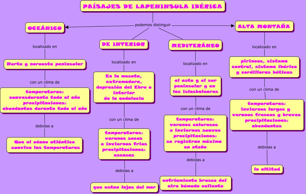 Este mapa conceptual tiene información relacionada a: lucia carmona mota 3ºA Ud. 2, temperaturas: veranos calurosos e inviernos suaves precipitaciones: se registran máxima en otoño debidas a enfriamiento brusco del aire húmedo caliente, Norte y noroeste peninsular con un clima de temperaturas: suavesdurante todo el año precipitaciones: abundantes durante todo el año, temperaturas: veranos secos e inviernos frios precipitaciones: escasas debidas a que estan lejos del mar, OCEÁNICO localizado en Norte y noroeste peninsular, PAÍSAJES DE LAPENINSULA IBÉRICA podemos distinguir DE INTERIOR, PAÍSAJES DE LAPENINSULA IBÉRICA podemos distinguir MEDITERÁNEO, el este y el sur peninsular y en las islasbaleares con un clima de temperaturas: veranos calurosos e inviernos suaves precipitaciones: se registran máxima en otoño, PAÍSAJES DE LAPENINSULA IBÉRICA podemos distinguir OCEÁNICO, temperaturas: inviernos largos y veranos frescos y breves precipitaciones: abundantes debidas a la altitud, MEDITERÁNEO localizado en el este y el sur peninsular y en las islasbaleares