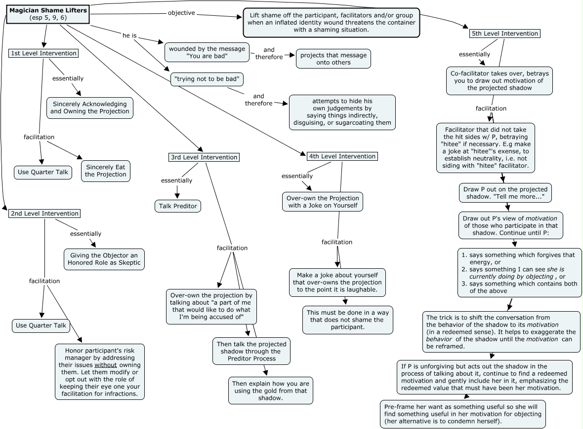 This Concept Map has information related to: Magician Shame Lifters, 4th Level Intervention essentially Over-own the Projection with a Joke on Yourself, 5th Level Intervention essentially Co-facilitator takes over, betrays you to draw out motivation of the projected shadow, 3rd Level Intervention essentially Talk Preditor, Magician Shame Lifters (esp 5, 9, 6) 2nd Level Intervention, 5th Level Intervention facilitation Facilitator that did not take the hit sides w/ P, betraying "hitee" if necessary. E.g make a joke at "hitee"'s exense, to establish neutrality, i.e. not siding with "hitee" facilitator., 1st Level Intervention essentially Sincerely Acknowledging and Owning the Projection, 2nd Level Intervention essentially Giving the Objector an Honored Role as Skeptic, 5th Level Intervention facilitation 1. says something which forgives that energy, or 2. says something I can see she is currently doing by objecting, or 3. says something which contains both of the above, 1. says something which forgives that energy, or 2. says something I can see she is currently doing by objecting, or 3. says something which contains both of the above The trick is to shift the conversation from the behavior of the shadow to its motivation (in a redeemed sense). It helps to exaggerate the behavior of the shadow until the motivation can be reframed., Magician Shame Lifters (esp 5, 9, 6) he is wounded by the message "You are bad"
