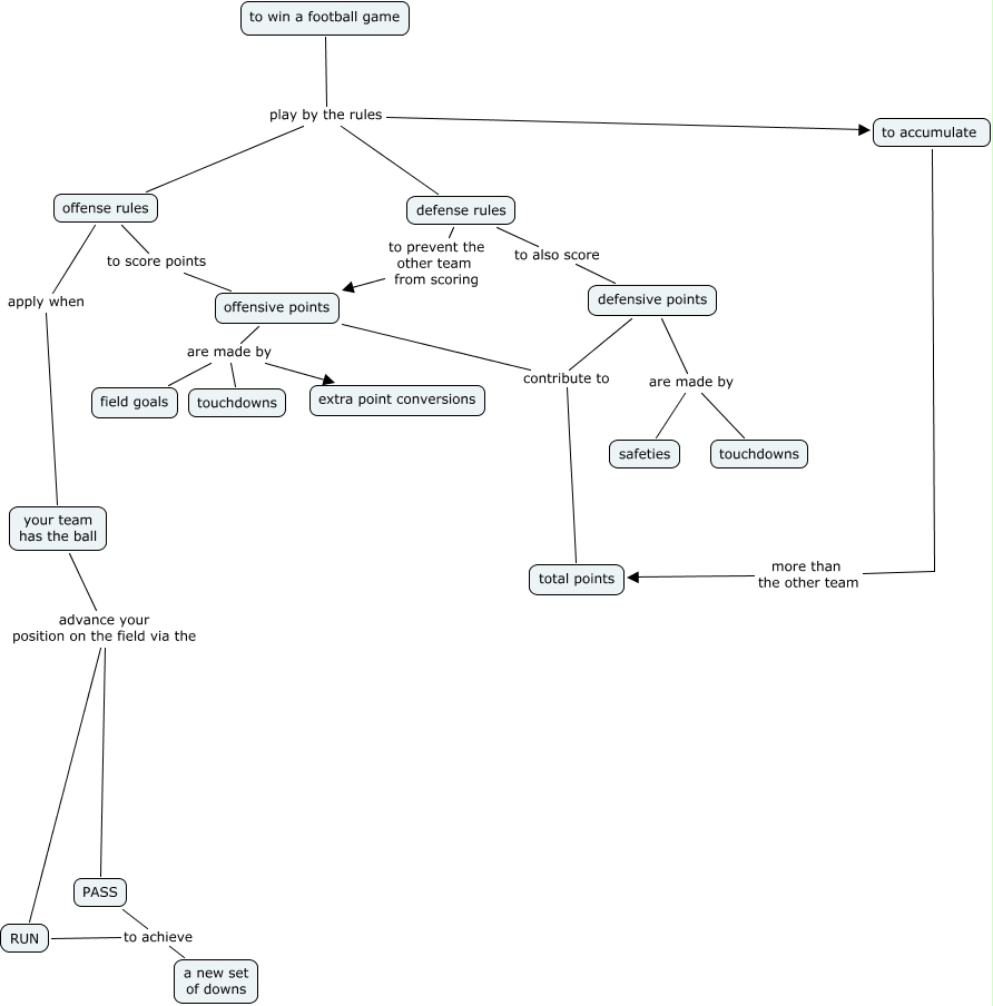 This Concept Map has information related to: Football, offense rules apply when your team has the ball, defensive points are made by safeties, defensive points are made by touchdowns, RUN to achieve a new set of downs, to accumulate more than the other team total points, defense rules to prevent the other team from scoring offensive points, to win a football game play by the rules offense rules, offensive points are made by extra point conversions, offense rules to score points offensive points, to win a football game play by the rules to accumulate