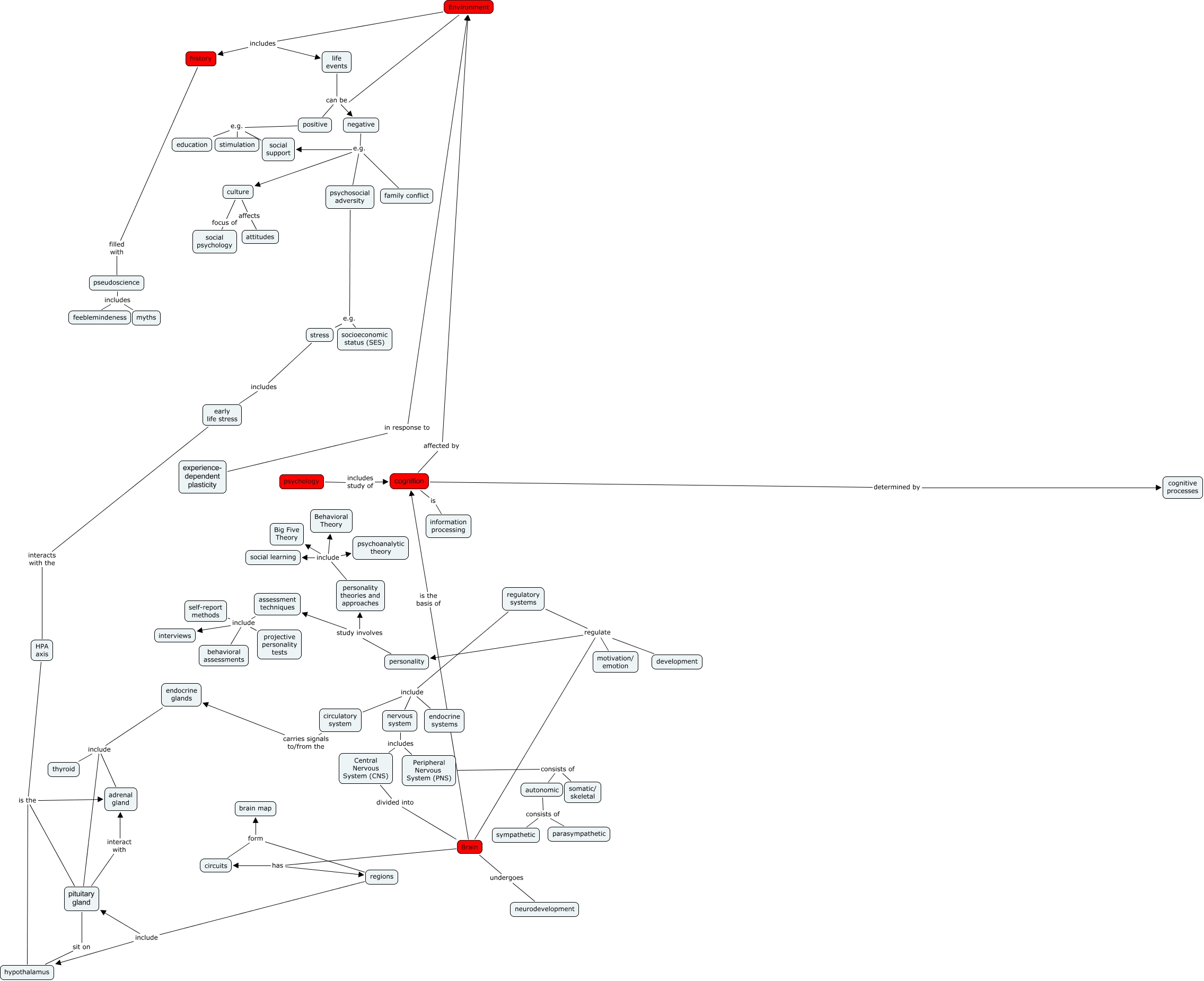 Psychology MIX, cognition affected by Environment, Central Nervous System (CNS) divided into Brain, assessment techniques include behavioral assessments, regulatory systems regulate motivation/ emotion, Environment can be negative, circuits form brain map, regulatory systems include circulatory system, positive e.g. social support, negative e.g. family conflict, pseudoscience includes feeblemindeness