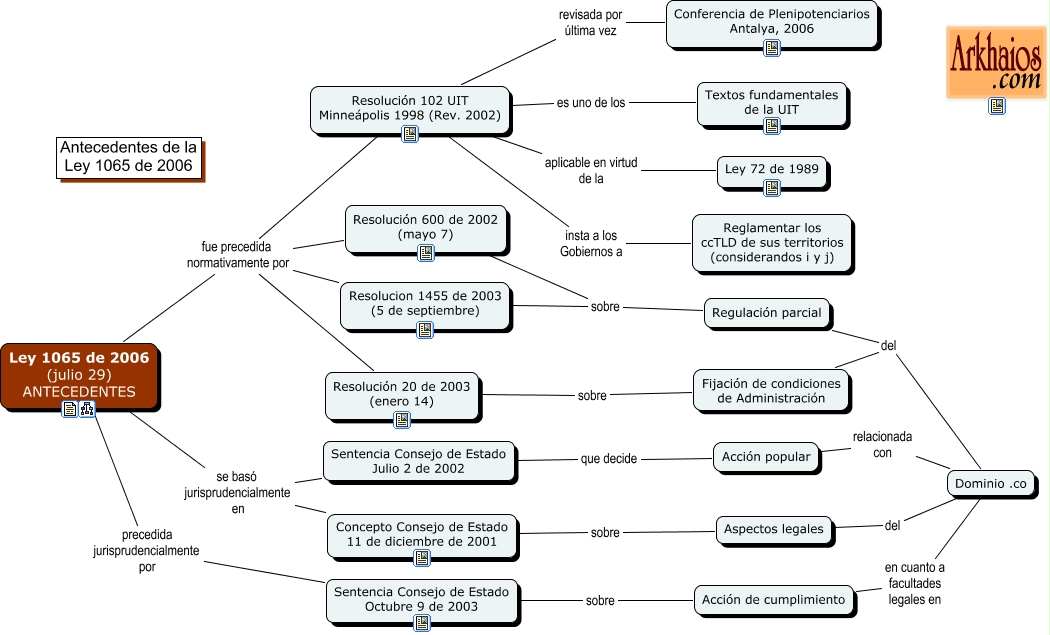 Este mapa conceptual tiene información relacionada a: LEY DE DOMINIO CO - ANTECEDENTES, Ley 1065 de 2006 (julio 29) ANTECEDENTES fue precedida normativamente por Resolución 600 de 2002 (mayo 7), Resolución 102 UIT Minneápolis 1998 (Rev. 2002) es uno de los Textos fundamentales de la UIT, Resolución 102 UIT Minneápolis 1998 (Rev. 2002) insta a los Gobiernos a Reglamentar los ccTLD de sus territorios (considerandos i y j), Sentencia Consejo de Estado Octubre 9 de 2003 sobre Acción de cumplimiento, Regulación parcial del Dominio .co, Ley 1065 de 2006 (julio 29) ANTECEDENTES fue precedida normativamente por Resolucion 1455 de 2003 (5 de septiembre), Ley 1065 de 2006 (julio 29) ANTECEDENTES se basó jurisprudencialmente en Sentencia Consejo de Estado Julio 2 de 2002, Ley 1065 de 2006 (julio 29) ANTECEDENTES fue precedida normativamente por Resolución 20 de 2003 (enero 14), Concepto Consejo de Estado 11 de diciembre de 2001 sobre Aspectos legales, Acción de cumplimiento en cuanto a facultades legales en Dominio .co