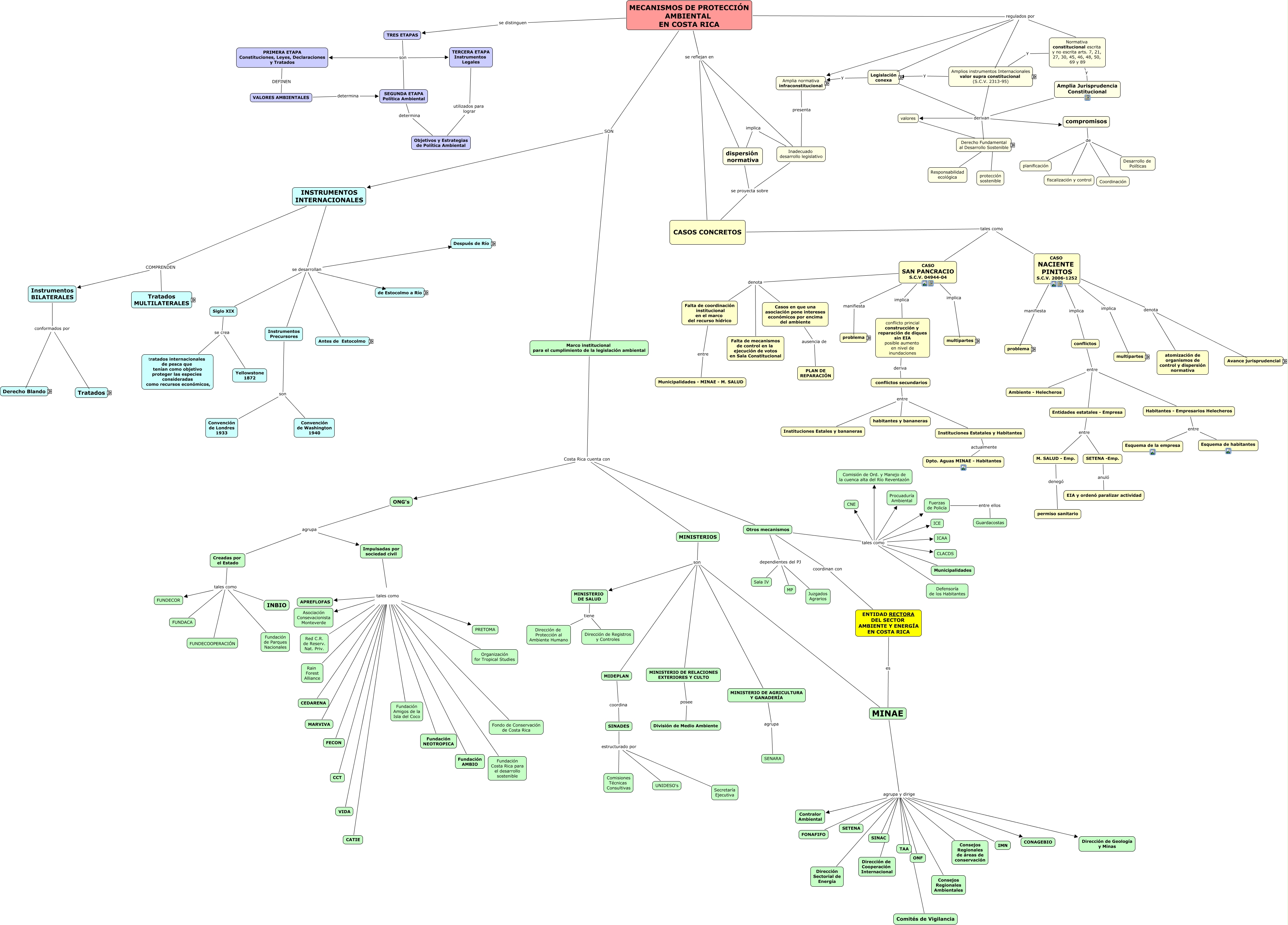 Este mapa conceptual tiene información relacionada a: Mecanismos de protección ambiental (con nodos animados), MINISTERIOS son MINAE, ENTIDAD RECTORA DEL SECTOR AMBIENTE Y ENERGÍA EN COSTA RICA es MINAE, Otros mecanismos tales como Comisión de Ord. y Manejo de la cuenca alta del Río Reventazón, Impulsadas por sociedad civil tales como PRETOMA, Marco institucional para el cumplimiento de la legislación ambiental Costa Rica cuenta con ONG's, MECANISMOS DE PROTECCIÓN AMBIENTAL EN COSTA RICA regulados por Legislación conexa Ley ARESEP 7593 Ley de Planificación Urbana N 4240 Ley de Construcciones N 833 Reglam. Construcciones Código de Minería N 6797 Reglamento N 29300-Minae Código Municipal N 7794 Código Penal N 4573 Reforma al C. Penal N 8250 Código Procesal Penal N 7594 LRJCAN 3667 CPCAN 8508 LGAPN 6227 Ley de Adm. Fin. de la Rep.y Presup.. Públicos N 8131 Ley Gen de Control Interno N 8292, MINAE agrupa y dirige SETENA, CASO NACIENTE PINITOS S.C.V. 2006-1252 denota atomización de organismos de control y dispersión normativa, MINAE agrupa y dirige Consejos Regionales Ambientales, Impulsadas por sociedad civil tales como Organización for Tropical Studies