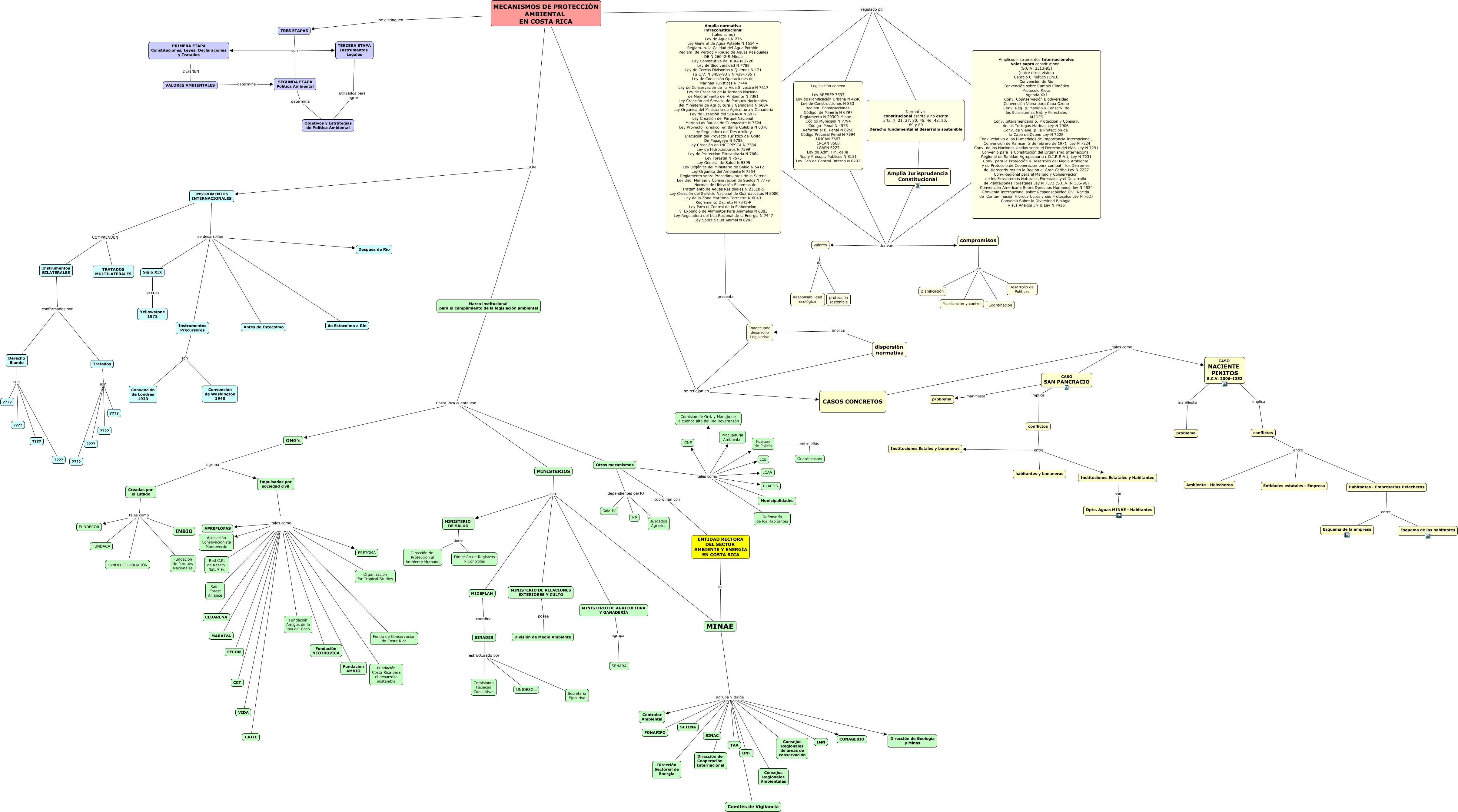 Este mapa conceptual tiene información relacionada a: Mecanismos de protección ambiental, MINISTERIOS son MINAE, Impulsadas por sociedad civil tales como PRETOMA, Otros mecanismos tales como Comisión de Ord. y Manejo de la cuenca alta del Río Reventazón, ENTIDAD RECTORA DEL SECTOR AMBIENTE Y ENERGÍA EN COSTA RICA es MINAE, MINAE agrupa y dirige SETENA, MECANISMOS DE PROTECCIÓN AMBIENTAL EN COSTA RICA regulado por Legislación conexa Ley ARESEP 7593 Ley de Planificación Urbana N 4240 Ley de Construcciones N 833 Reglam. Construcciones Código de Minería N 6797 Reglamento N 29300-Minae Código Municipal N 7794 Código Penal N 4573 Reforma al C. Penal N 8250 Código Procesal Penal N 7594 LRJCAN 3667 CPCAN 8508 LGAPN 6227 Ley de Adm. Fin. de la Rep.y Presup.. Públicos N 8131 Ley Gen de Control Interno N 8292, Marco institucional para el cumplimiento de la legislación ambiental Costa Rica cuenta con ONG's, Amplia normativa infraconstitucional (tales como) Ley de Aguas N 276 Ley General de Agua Potable N 1634 y Reglam. p. la Calidad del Agua Potable Reglam. de Vertido y Reuso de Aguas Residuales DE N 26042-S-Minae Ley Constitutiva del ICAA N 2726 Ley de Biodiversidad N 7788 Ley de Cercas Divisorias y Quemas N 121 (S.C.V. N 3459-93 y N 439-I-95 ) Ley de Concesión Operaciones de Marinas Turísticas N 7744 Ley de Conservación de la Vida Silvestre N 7317 Ley de Creación de la Jornada Nacional de Mejoramiento del Ambiente N 7381 Ley Creación del Servicio de Parques Nacionales del Ministerio de Agricultura y Ganadería N 6084 Ley Orgánica del Ministerio de Agricultura y Ganadería Ley de Creación del SENARA N 6877 Ley Creación del Parque Nacional Marino Las Baulas de Guanacaste N 7524 Ley Proyecto Turístico en Bahía Culebra N 6370 Ley Reguladora del Desarrollo y Ejecución del Proyecto Turístico del Golfo De Papagayo N 6758 Ley Creación de INCOPESCA N 7384 Ley de Hidrocarburos N 7399 Ley de Protección Fitosanitaria N 7664 Ley Forestal N 7575 Ley General de Salud N 5395 Ley Orgánica del Ministerio de Salud N 5412 Ley Orgánica del Ambiente N 7554 Reglamento sobre Procedimientos de la Setena Ley Uso, Manejo y Conservación de Suelos N 7779 Normas de Ubicación Sistemas de Tratamiento de Aguas Residuales N 21518-S Ley Creación del Servicio Nacional de Guardacostas N 8000 Ley de la Zona Marítimo Terrestre N 6043 Reglamento Decreto N 7841-P Ley Para el Control de la Elaboración y Expendio de Alimentos Para Animales N 6883 Ley Reguladora del Uso Racional de la Energía N 7447 Ley Sobre Salud Animal N 6243 derivan valores, MINAE agrupa y dirige Consejos Regionales Ambientales, Impulsadas por sociedad civil tales como Organización for Tropical Studies