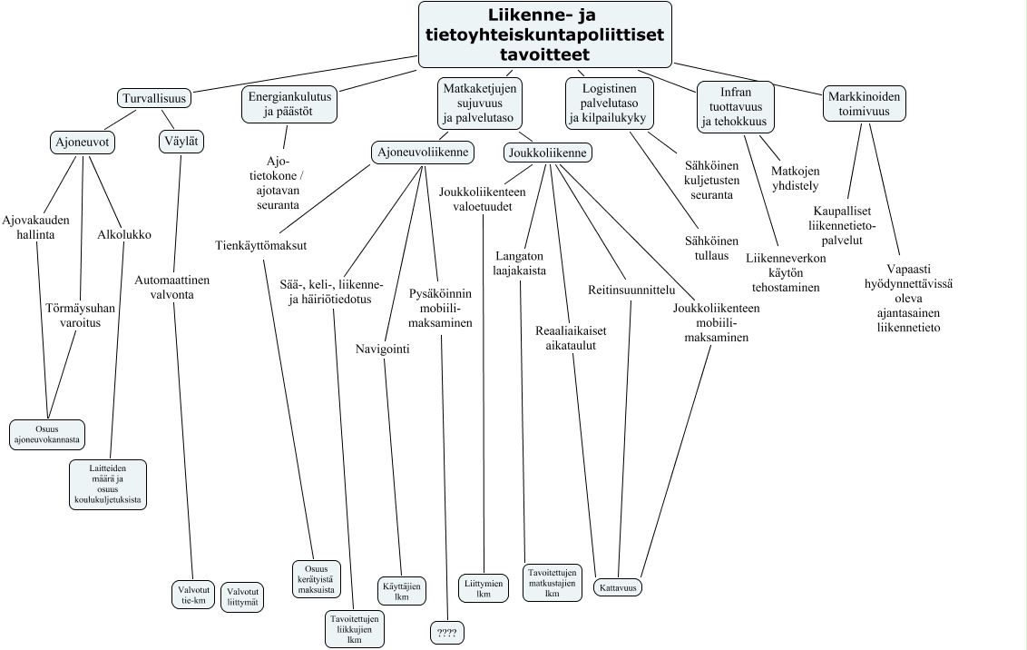 Palmitta tavoitteista mittareihin, Liikenne- ja tietoyhteiskuntapoliittiset tavoitteet Infran tuottavuus ja tehokkuus Liikenneverkon käytön tehostaminen, Ajoneuvoliikenne Navigointi Käyttäjien lkm, Ajoneuvot Alkolukko Laitteiden määrä ja osuus koulukuljetuksista, Joukkoliikenne Joukkoliikenteen mobiili- maksaminen Kattavuus, Ajoneuvot Ajovakauden hallinta Osuus ajoneuvokannasta, Liikenne- ja tietoyhteiskuntapoliittiset tavoitteet Turvallisuus Ajoneuvot, Liikenne- ja tietoyhteiskuntapoliittiset tavoitteet Energiankulutus ja päästöt Ajo- tietokone / ajotavan seuranta, Osuus kerätyistä maksuista Tienkäyttömaksut Ajoneuvoliikenne, Liikenne- ja tietoyhteiskuntapoliittiset tavoitteet Infran tuottavuus ja tehokkuus Matkojen yhdistely, Liikenne- ja tietoyhteiskuntapoliittiset tavoitteet Logistinen palvelutaso ja kilpailukyky Sähköinen tullaus