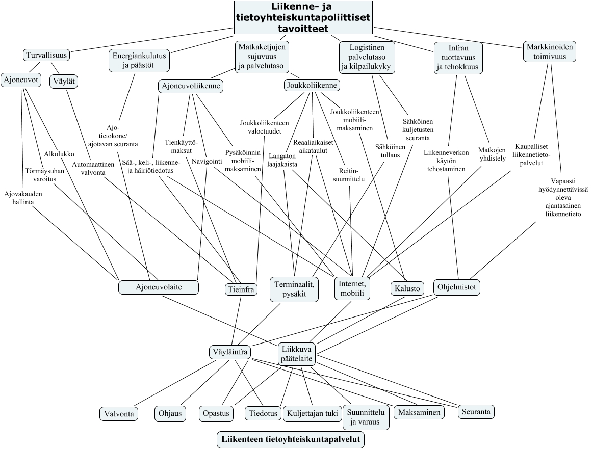Palmitta työn kokonaiskuva, Liikenne- ja tietoyhteiskuntapoliittiset tavoitteet Turvallisuus Väylät, Ohjelmistot Väyläinfra Terminaalit, pysäkit, Seuranta Liikkuva päätelaite Kalusto, Joukkoliikenne Reaaliaikaiset aikataulut Terminaalit, pysäkit, Suunnittelu ja varaus Liikkuva päätelaite Opastus, Joukkoliikenne Joukkoliikenteen mobiili- maksaminen Kalusto, Ajoneuvot Törmäysuhan varoitus Ajoneuvolaite, Ohjelmistot Liikkuva päätelaite Kuljettajan tuki, Opastus Väyläinfra Maksaminen, Seuranta Liikkuva päätelaite Kuljettajan tuki