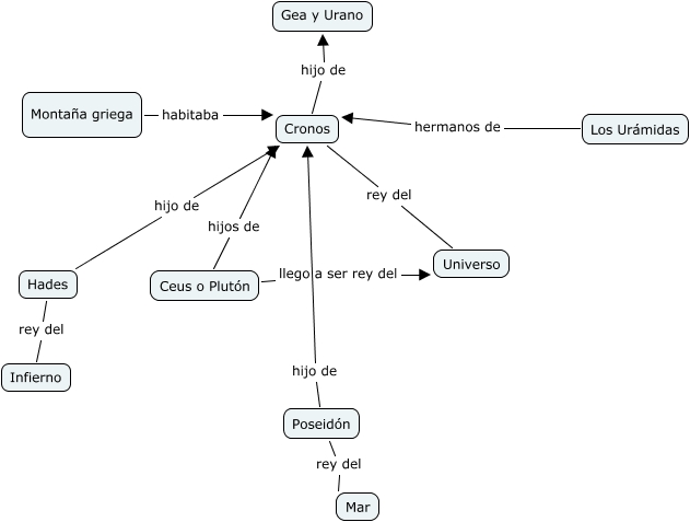 Este mapa conceptual tiene información relacionada a: Montaña Griega Laura, Montaña griega habitaba Cronos, Los Urámidas hermanos de Cronos, Poseidón hijo de Cronos, Hades hijo de Cronos, Cronos rey del Universo, Ceus o Plutón hijos de Cronos, Ceus o Plutón llego a ser rey del Universo, Poseidón rey del Mar, Cronos hijo de Gea y Urano, Hades rey del Infierno