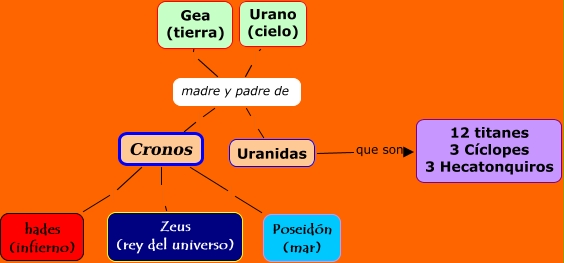 Este mapa conceptual tiene información relacionada a: montaña griega dany MAnu, Cronos Zeus (rey del universo), Gea (tierra) madre y padre de, Cronos hades (infierno), Urano (cielo) madre y padre de, Cronos Poseidón (mar), madre y padre de Cronos, Uranidas que son 12 titanes 3 Cíclopes 3 Hecatonquiros, madre y padre de Uranidas