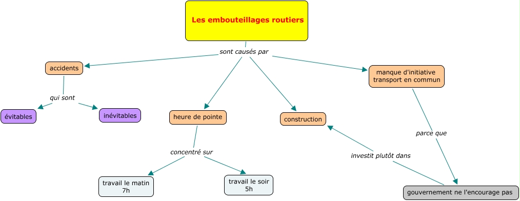 This Concept Map has information related to: embouteillages routiers, Les embouteillages routiers sont causés par accidents, Les embouteillages routiers sont causés par manque d'initiative transport en commun, heure de pointe concentré sur travail le soir 5h, accidents qui sont inévitables, Les embouteillages routiers sont causés par construction, heure de pointe concentré sur travail le matin 7h, accidents qui sont évitables, manque d'initiative transport en commun parce que gouvernement ne l'encourage pas, gouvernement ne l'encourage pas investit plutôt dans construction, Les embouteillages routiers sont causés par heure de pointe